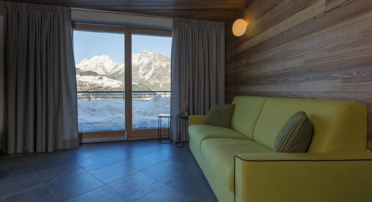 L’appartamento Fiocco di Neve è dotato di una terrazza esterna in comune con vista panoramica su Bormio.